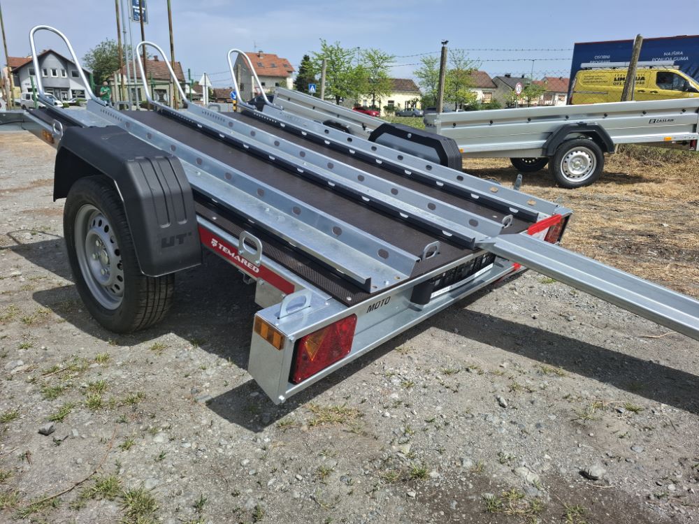 Poljska aluminijska prikolica TEMARED dolazi u kiper varijanti sa podnicom s čak tri nosača za motocikle, navoznom rampom, trećim kotačem i LED svjetlima. Još nešto važno za sve motoriste, upravo ovu prikolicu možete i iznajmiti po cijeni od 30 € po danu.